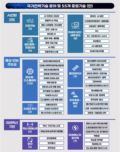 AI인프라 고도화, 블록체인, 핵융합, 지능형 전력망, 재생에너지, CCUS 등을 신설하고 국방반도체, 바이오인공장기·혈액, BCI, 재사용발사체, 드론, 친환경 자율운항 선박 기술 등은 보강됐다.