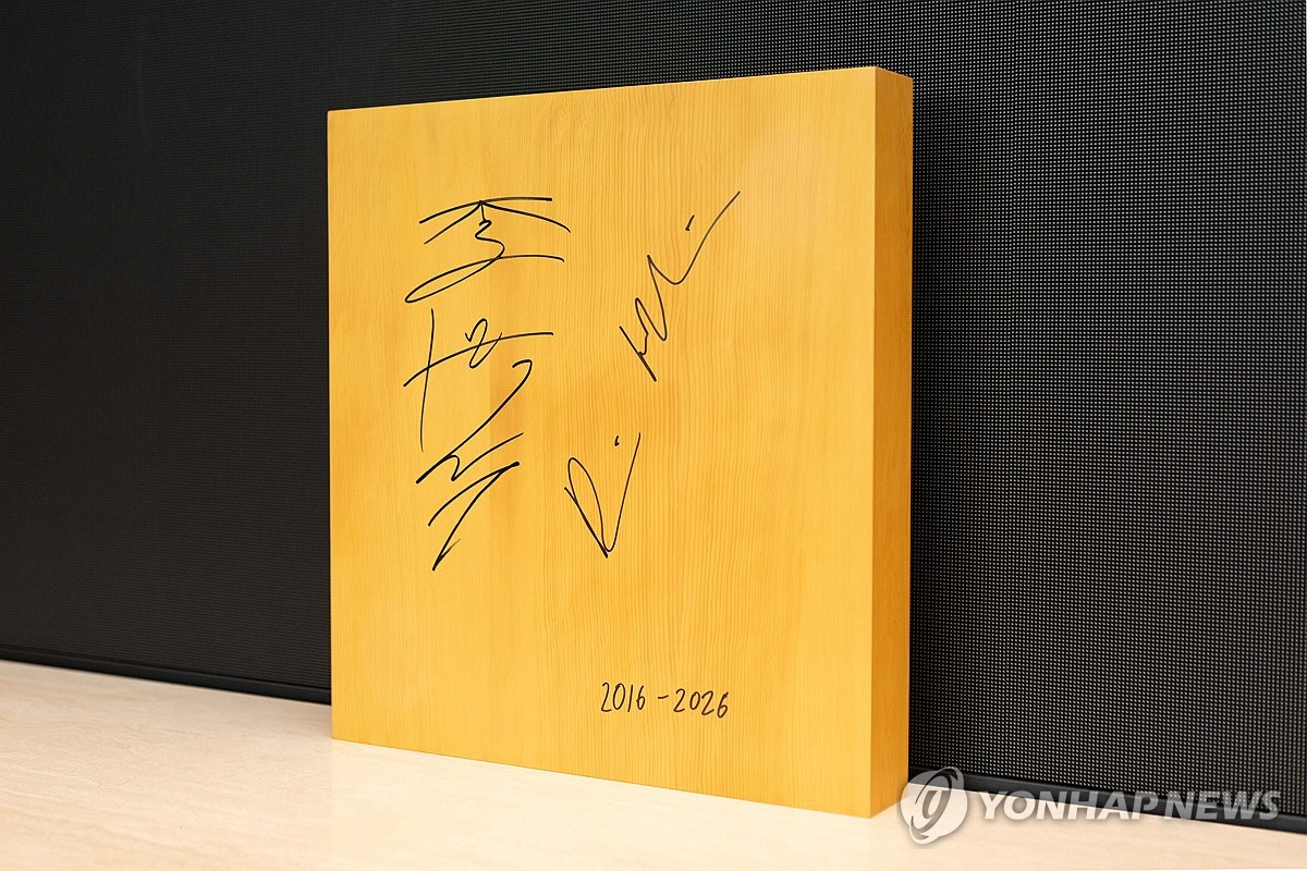 (서울=연합뉴스) 이재명 대통령에게 데미스 허사비스 구글 딥마인드 최고경영자(CEO)가 27일 선물한 바둑판. 2016년 알파고 대국 10주년을 기념해 이세돌 9단과 허사비스 CEO가 서명한 바둑판이다. 2026.4.27 [청와대 제공. 재판매 및 DB 금지] photo@yna.co.kr