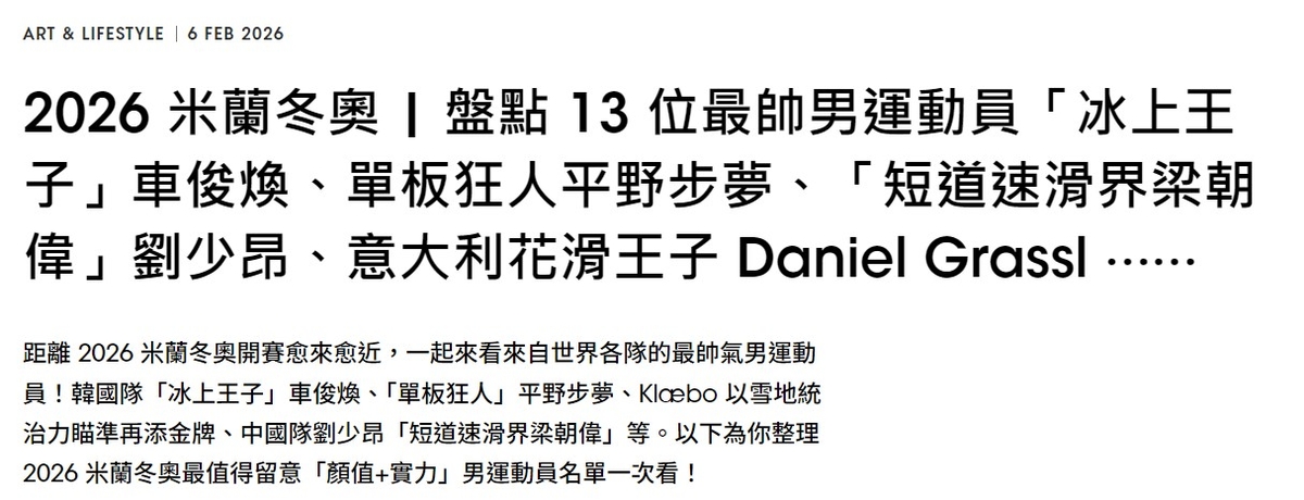 보그 홍콩은 6일(현지시간) 홈페이지에 '2026 밀라노 동계 올림픽/가장 잘생긴 남자 선수 13인 총정리'라는 제목의 기사를 올리고 "세계 각국을 대표하는 가장 멋진 남자 운동선수를 살펴본다"며 비주얼과 실력을 겸비한 '미남 선수 순위'를 공개했다.