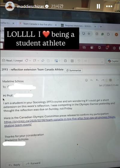 2026 밀라노·코르티나담페초 동계 올림픽에 참가한 캐나다 피겨 스케이팅 국가대표 매들린 시자스(22)가 재학 중인 대학교 교수에게 과제 제출 기한 연장을 요청해 화제를 모으고 있다.