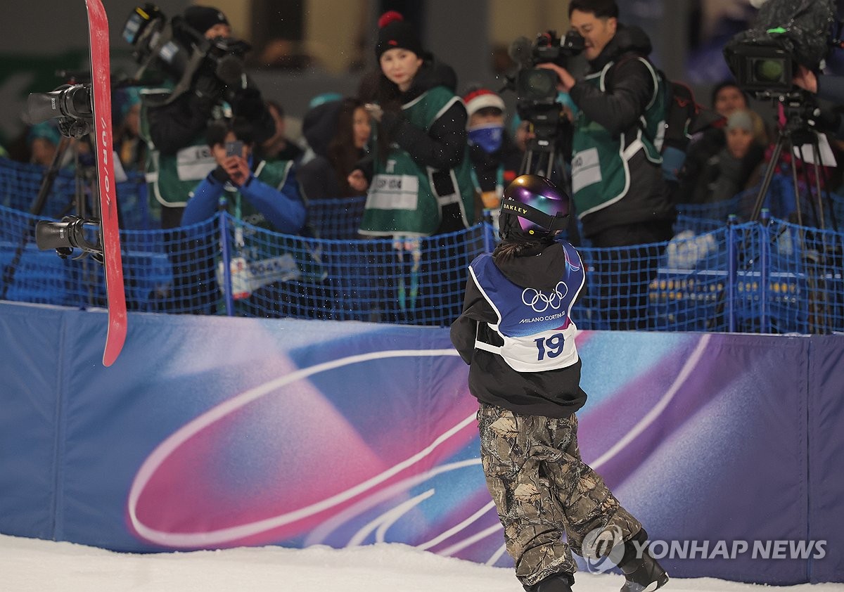 (리비뇨=연합뉴스) 류영석 기자 = 9일(현지시간) 이탈리아 리비뇨 스노파크에서 열린 2026 밀라노-코르티나담페초 동계올림픽 스노보드 여자 빅에어 결선에서 유승은이 2차 시기를 마친 뒤 보드를 집어던지고 있다. 2026.2.10 ondol@yna.co.kr