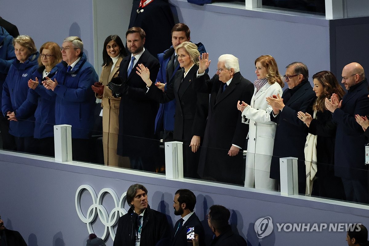 (밀라노=연합뉴스) 서대연 기자 = 6일(현지시간) 이탈리아 밀라노 산시로 스타디움에서 열린 2026 밀라노-코르티나담페초 동계올림픽 개회식. 세르조 마타렐라 이탈리아 대통령, 커스티 코번트리 IOC 위원장이 관중에 인사하고 있다. 2026.2.7 dwise@yna.co.kr