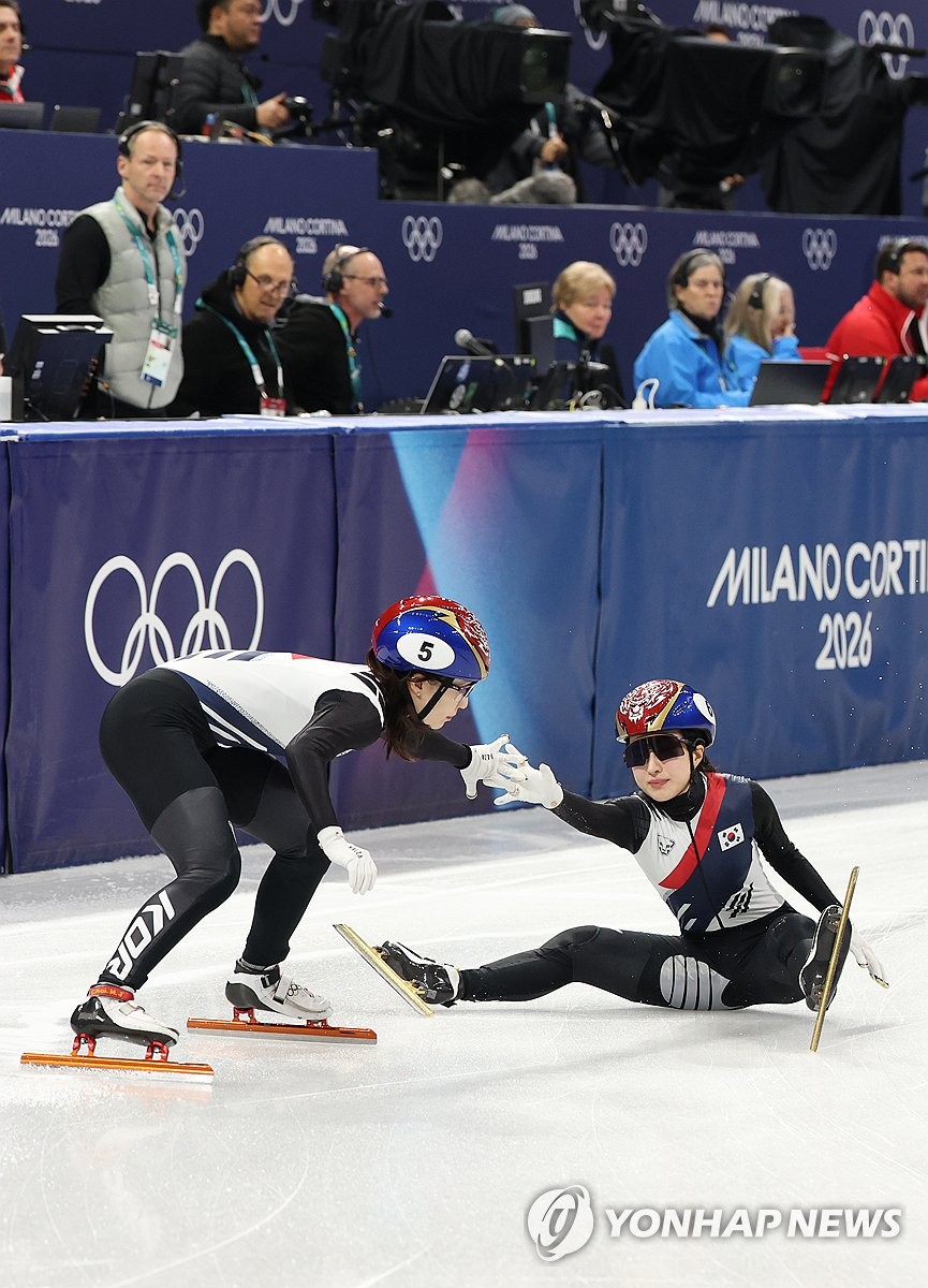 (밀라노=연합뉴스) 신준희 기자 = 10일(현지시간) 이탈리아 밀라노 아이스스케이팅 아레나에서 열린 2026 밀라노ㆍ코르티나담페초 동계올림픽 쇼트트랙 혼성계주 준결승에서 미국 선수에 의해 넘어진 김길리가 최민정과 터치하고 있다. 2026.2.10 hama@yna.co.kr