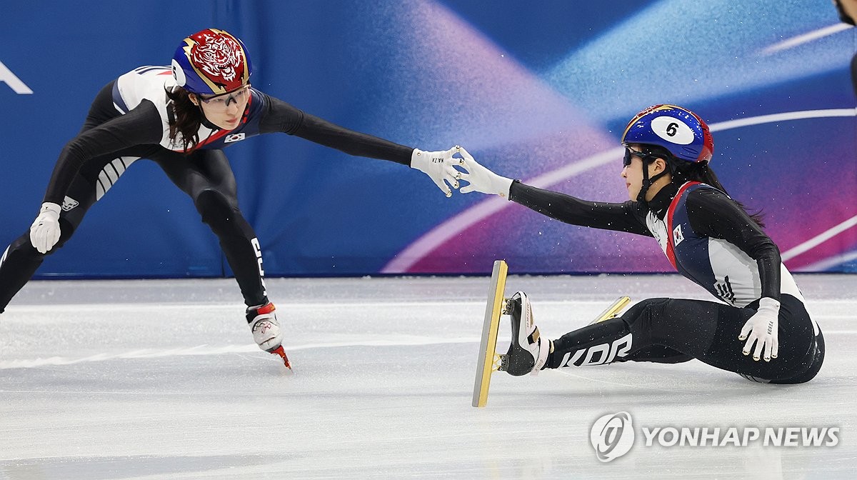 (밀라노=연합뉴스) 서대연 기자 = 10일(현지시간) 이탈리아 밀라노 아이스스케이팅 아레나에서 열린 2026 밀라노ㆍ코르티나담페초 동계올림픽 쇼트트랙 혼성계주 준결승에서 미국 선수에 의해 넘어진 김길리가 최민정과 터치하고 있다. 2026.2.10 dwise@yna.co.kr