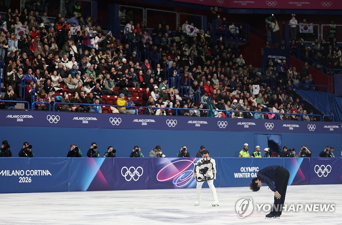 (밀라노=연합뉴스) 이지은 기자 = 10일(현지시간) 이탈리아 밀라노 아이스스케이팅 아레나에서 열린 2026 밀라노ㆍ코르티나담페초 동계올림픽 남자 싱글 쇼트 프로그램에 출전한 차준환이 연기를 마친 뒤 관중을 향해 인사하고 있다. 2026.2.11 jieunlee@yna.co.kr