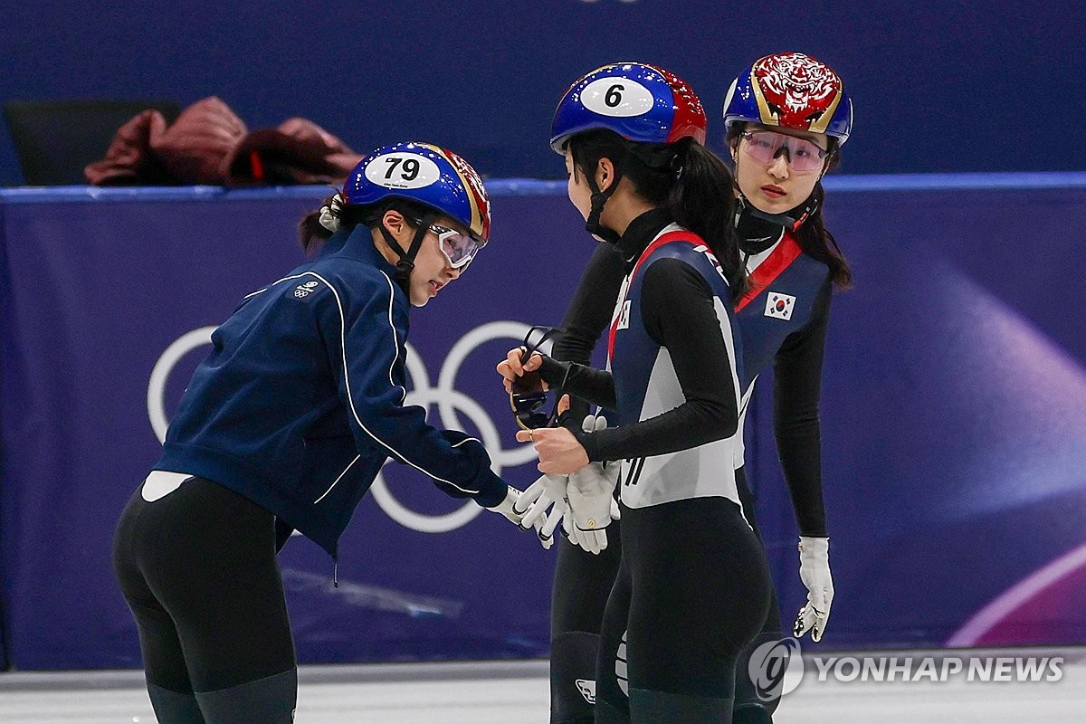 (밀라노=연합뉴스) 서대연 기자 = 11일(현지시간) 이탈리아 밀라노 아이스스케이팅 아레나에서 쇼트트랙 최민정과 이소연이 훈련 중 김길리의 상태를 확인하고 있다. 김길리는 전날 쇼트트랙 혼성계주 준결승에서 앞서 달리던 미국의 커린 스토더드가 넘어지며 충돌했다. 2026.2.11 dwise@yna.co.kr