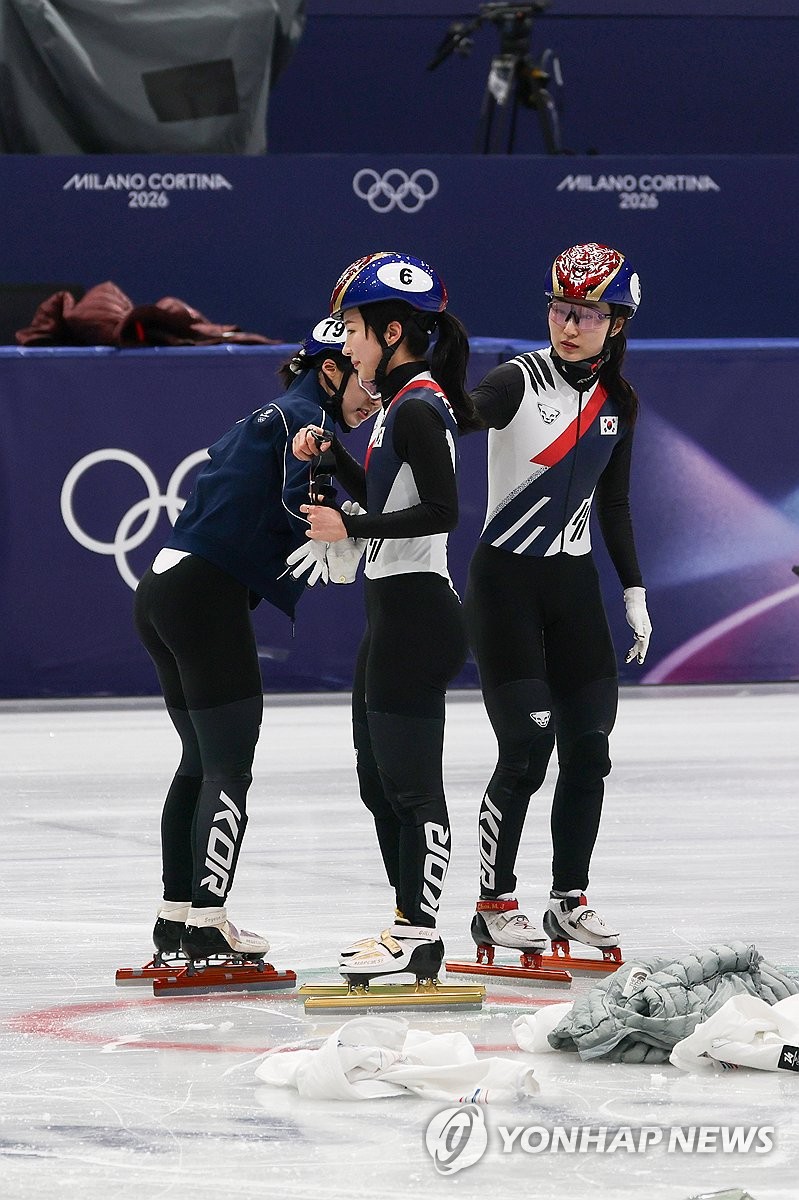 (밀라노=연합뉴스) 서대연 기자 = 11일(현지시간) 이탈리아 밀라노 아이스스케이팅 아레나에서 쇼트트랙 최민정과 이소연이 훈련 중 김길리의 상태를 확인하고 있다. 김길리는 전날 쇼트트랙 혼성계주 준결승에서 앞서 달리던 미국의 커린 스토더드가 넘어지며 충돌했다. 2026.2.11 dwise@yna.co.kr