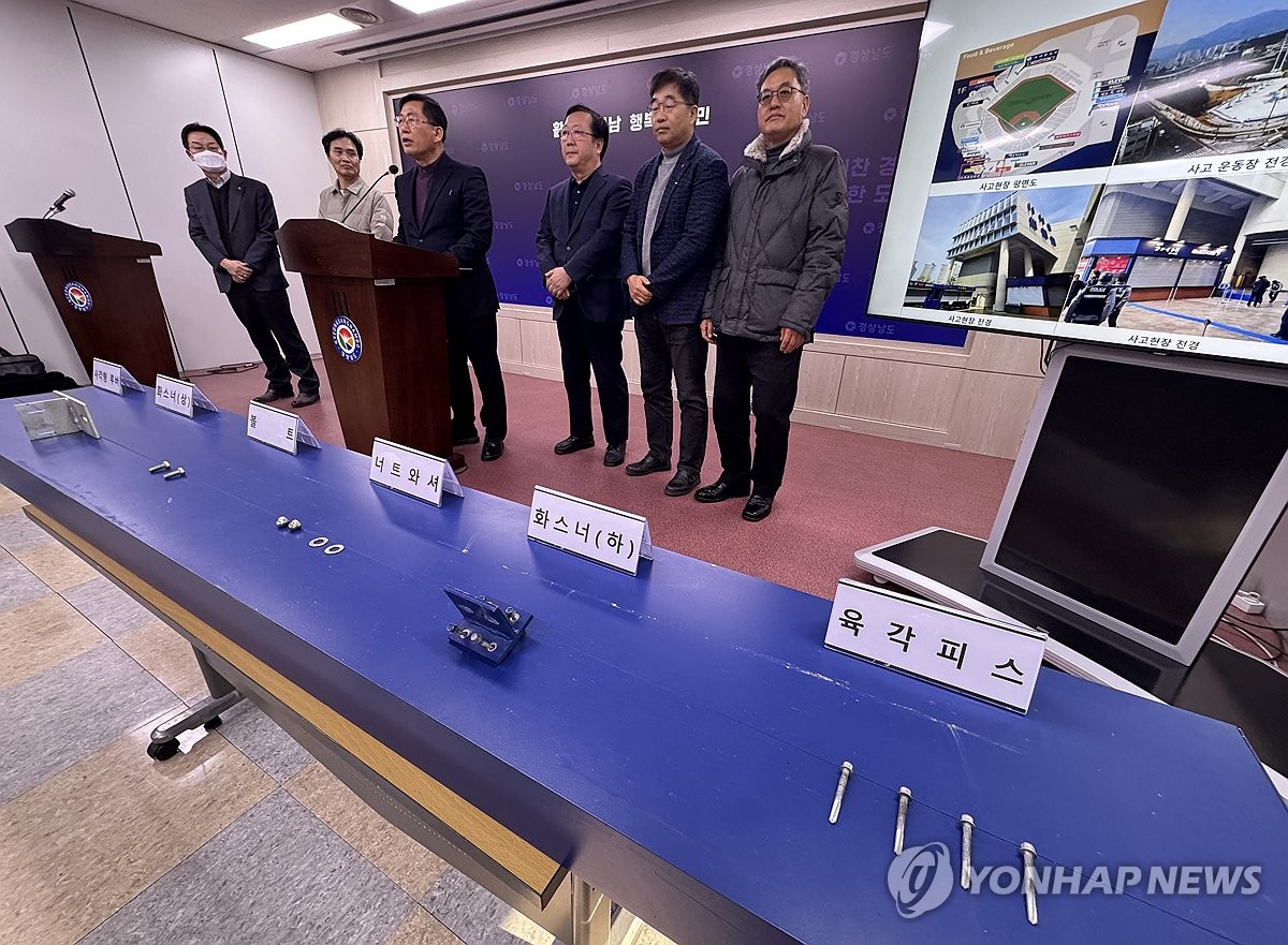 (창원=연합뉴스) 이정훈 기자 = 경남도 사고조사위원회가 12일 경남도청에서 이같은 창원NC파크 외부 구조물 탈락 사고 조사 결과를 발표하고 있다. 2026.2.12 seaman@yna.co.kr