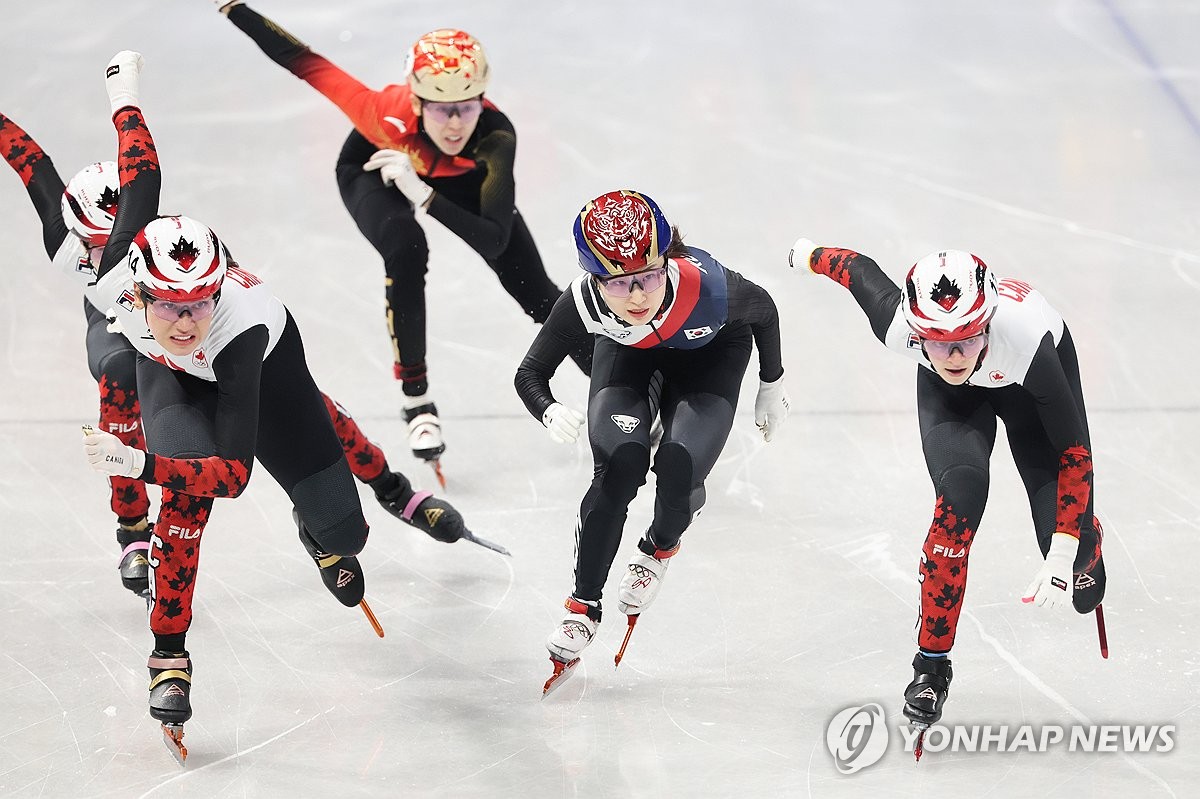(밀라노=연합뉴스) 서대연 기자 = 12일(현지시간) 이탈리아 밀라노 아이스스케이팅 아레나에서 열린 2026 밀라노ㆍ코르티나담페초 동계올림픽 쇼트트랙 여자 500m 준결승에 출전한 최민정이 캐나다 대표팀 선수들과 레이스를 펼치고 있다. 2026.2.13 dwise@yna.co.kr