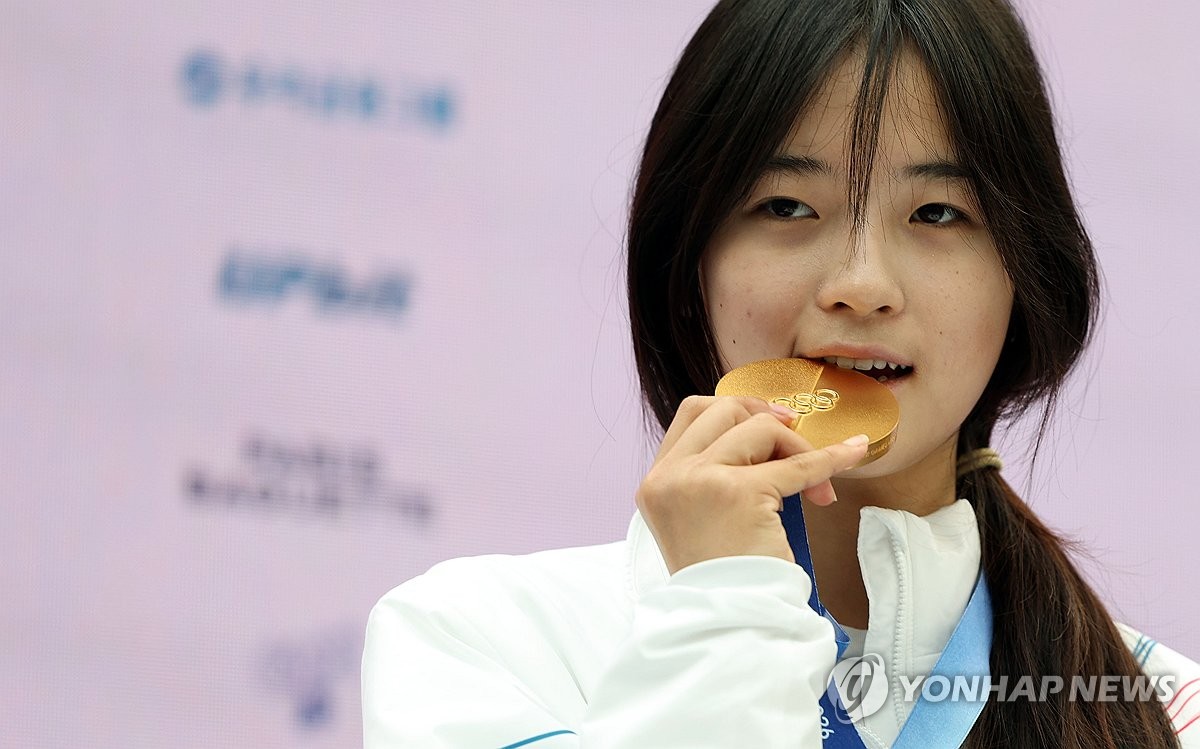 (밀라노=연합뉴스) 이지은 기자 = 2026 밀라노ㆍ코르티나담페초 동계올림픽 스노보드 여자 하프파이프에서 금메달을 차지한 최가온이 14일(현지시간) 이탈리아 밀라노 코리아하우스에서 열린 대한체육회 공식 기자회견에서 금메달을 깨물어 보고 있다. 2026.2.14 jieunlee@yna.co.kr