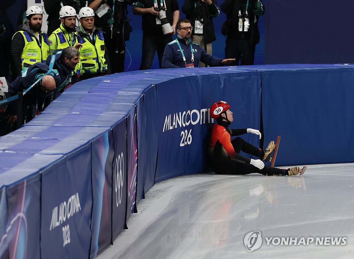 (밀라노=연합뉴스) 이지은 기자 = 14일(현지시간) 이탈리아 밀라노 아이스스케이팅 아레나에서 열린 2026 밀라노ㆍ코르티나담페초 동계올림픽 쇼트트랙 남자1,500m 준준결승에 출전한 임종언(113)이 넘어져있다. 2026.2.15 jieunlee@yna.co.kr