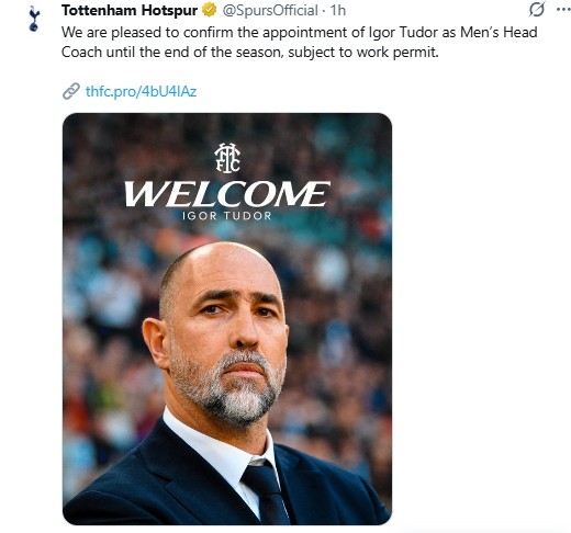 토트넘은 14일 "투도르를 이번 시즌 종료 시까지 남자팀을 이끌 감독으로 임명했다"고 밝혔다.