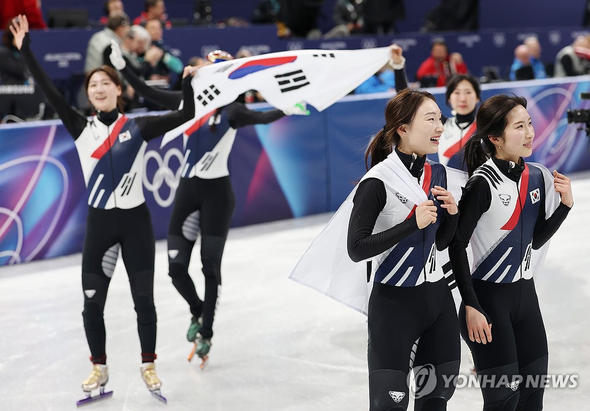(밀라노=연합뉴스) 신준희 기자 = 18일(현지시간) 이탈리아 밀라노 아이스스케이팅 아레나에서 열린 2026 밀라노-코르티나담페초 동계올림픽 쇼트트랙 여자 3000m 계주 결승에서 금메달을 따낸 한국 선수들이 세리머니를 하고 있다. 2026.2.19 hama@yna.co.kr