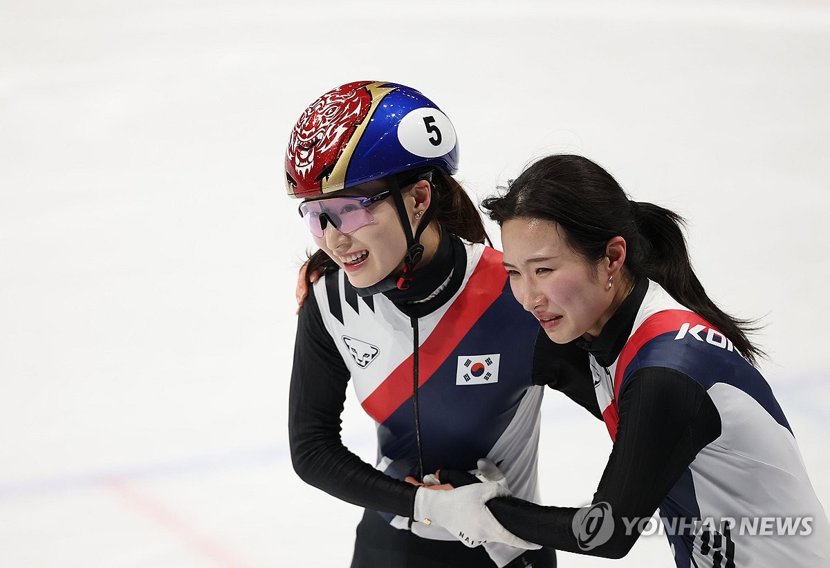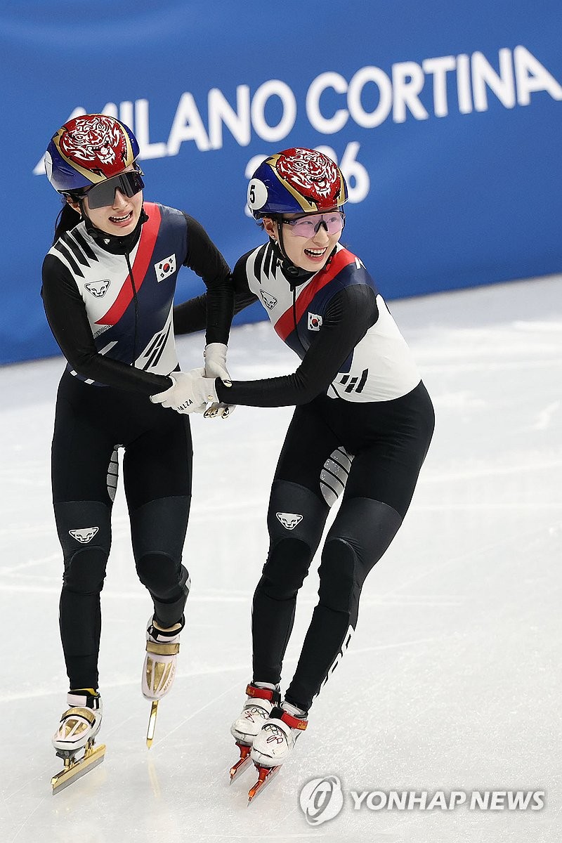(밀라노=연합뉴스) 이지은 기자 = 18일(현지시간) 이탈리아 밀라노 아이스스케이팅 아레나에서 열린 2026 밀라노-코르티나담페초 동계올림픽 쇼트트랙 여자 3000m 계주에서 금메달을 따낸 한국대표팀 최민정과 김길리가 기뻐하고 있다. 2026.2.19 jieunlee@yna.co.kr