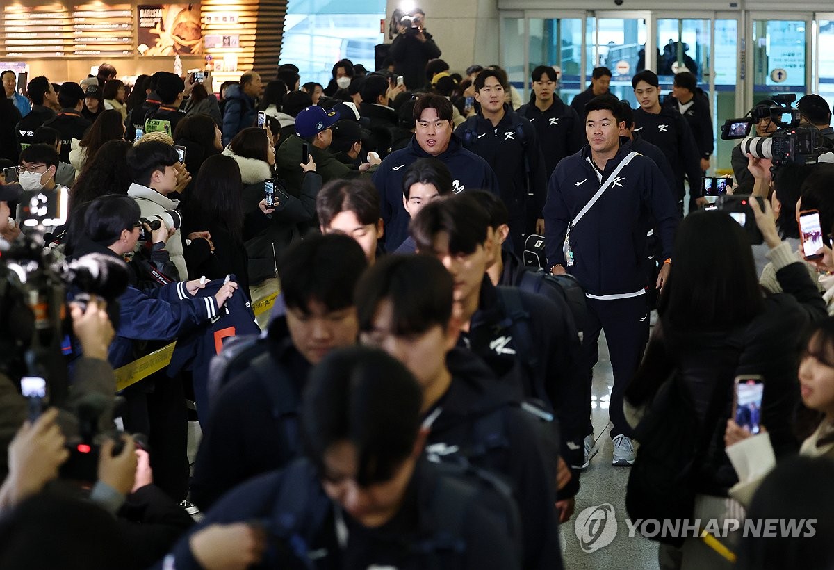 (영종도=연합뉴스) 윤동진 기자 = 류현진 등 한국 야구대표팀 선수들이 9일 인천국제공항 1터미널에서 월드베이스볼클래식(WBC) 1차 캠프지인 사이판으로 출국하고 있다. 2026.1.9 mon@yna.co.kr