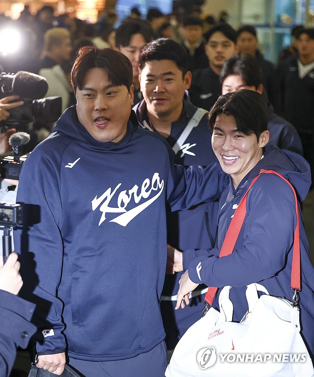(영종도=연합뉴스) 윤동진 기자 = 류현진(왼쪽), 김혜성을 비롯한 한국 야구대표팀 선수들이 9일 인천국제공항 1터미널에서 월드베이스볼클래식(WBC) 1차 캠프지인 사이판으로 출국하고 있다. 2026.1.9 mon@yna.co.kr
