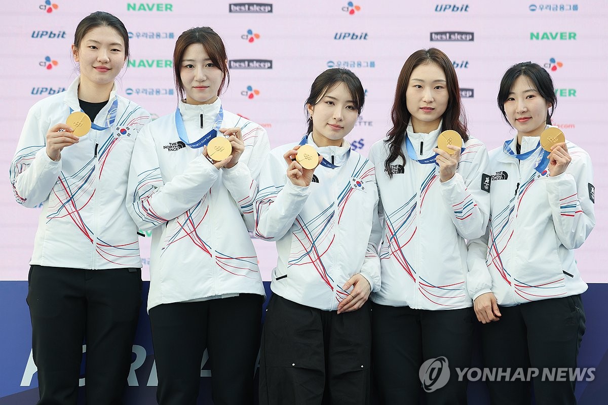 (밀라노=연합뉴스) 서대연 기자 = 쇼트트랙 여자 3,000m에서 금메달을 딴 대표팀 선수들이 21일(현지시간) 이탈리아 밀라노 코리아하우스에서 열린 기자회견에서 메달을 들고 기념촬영을 하고 있다. 왼쪽부터 심석희, 노도희, 김길리, 최민정, 이소연. 2026.2.21 dwise@yna.co.kr