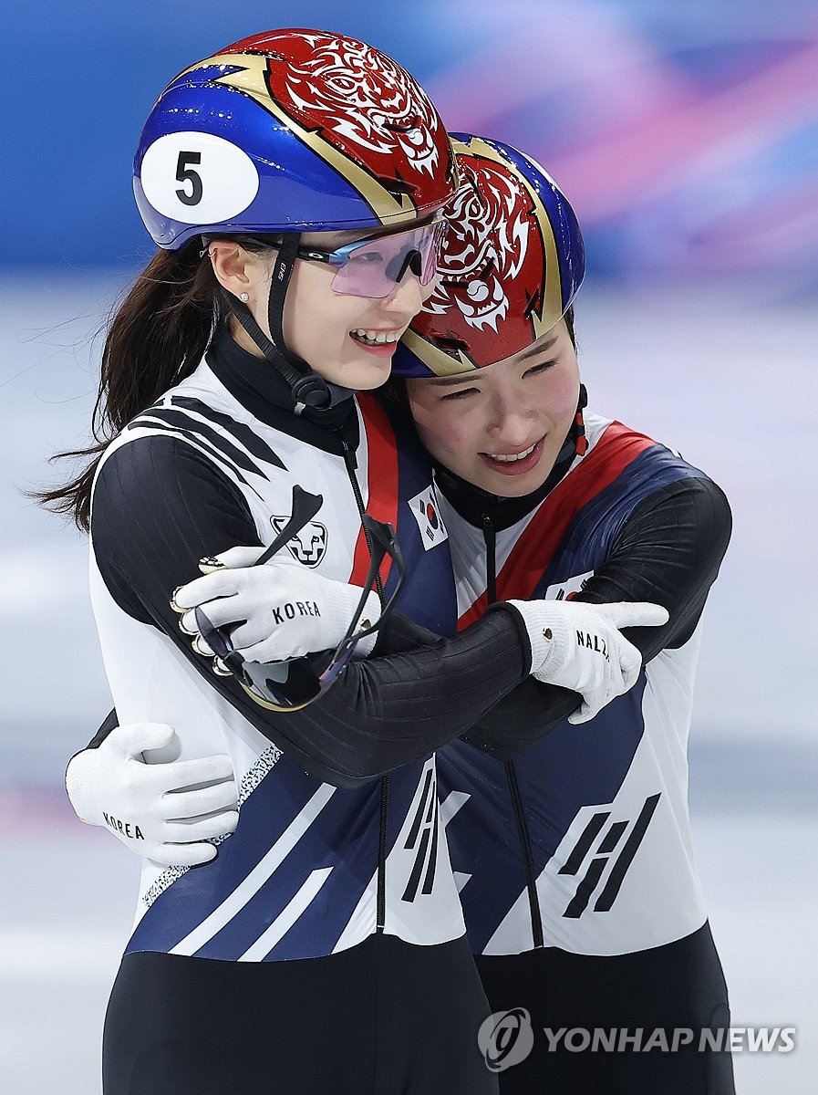 (밀라노=연합뉴스) 류영석 기자 = 20일(현지시간) 이탈리아 밀라노 아이스스케이팅 아레나에서 열린 2026 밀라노ㆍ코르티나담페초 동계올림픽 쇼트트랙 여자 1,500m 결승에서 은메달을 획득한 최민정이 금메달을 획득한 김길리를 축하해주고 있다. 2026.2.21 ondol@yna.co.kr