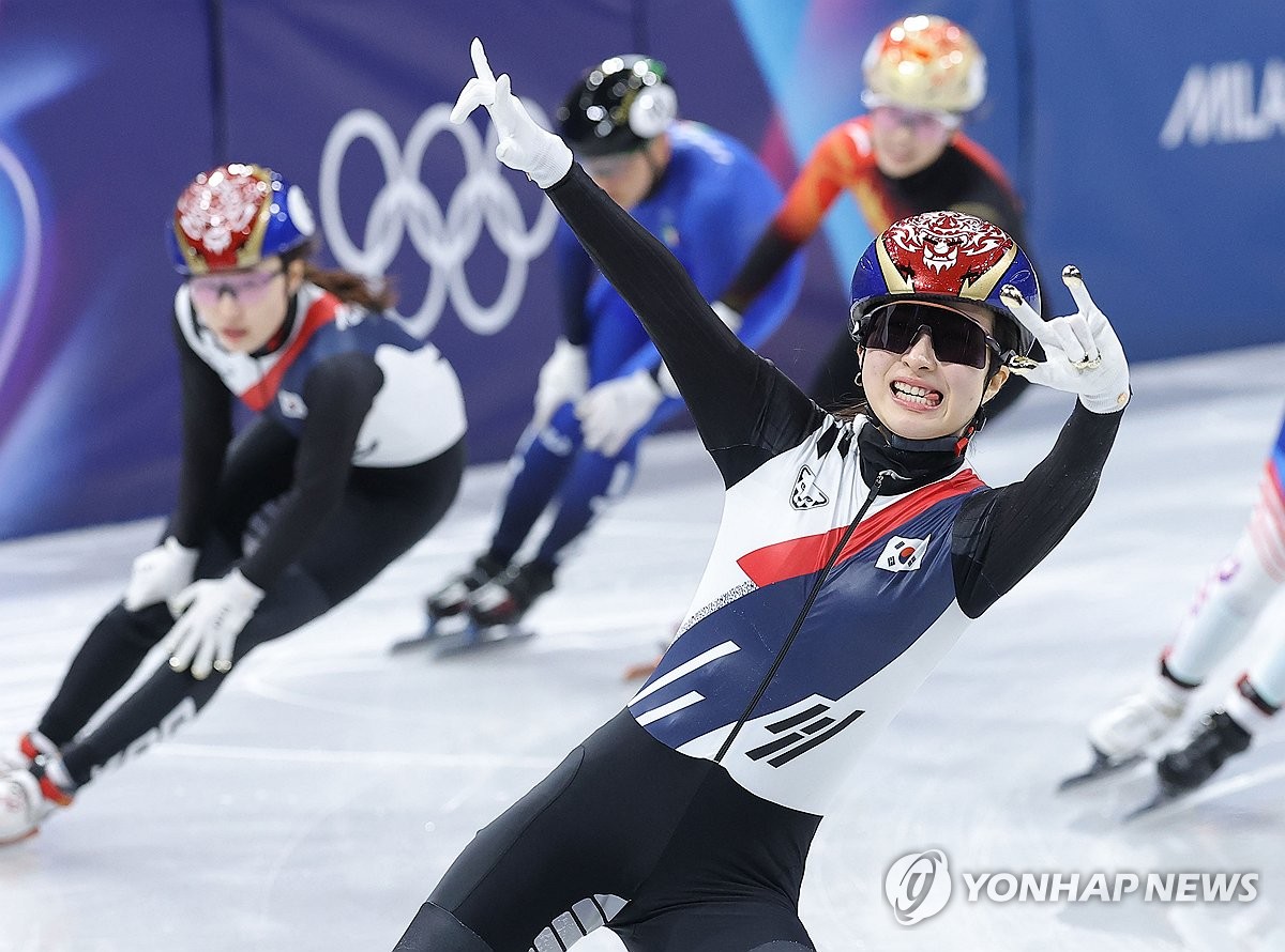 (밀라노=연합뉴스) 류영석 기자 = 20일(현지시간) 이탈리아 밀라노 아이스스케이팅 아레나에서 열린 2026 밀라노ㆍ코르티나담페초 동계올림픽 쇼트트랙 여자 1,500m 결승에서 김길리가 금메달을 획득한 뒤 세리머니를 하고 있다. 2026.2.21 ondol@yna.co.kr