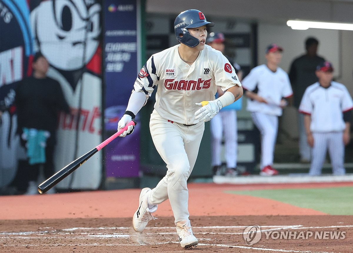 (부산=연합뉴스) 강선배 기자 = 1일 부산 사직야구장에서 열린 프로야구 LG 트윈스와 롯데 자이언츠의 경기. 3회 말 2사 1, 2루 롯데 고승민이 우익수 앞 1타점 안타를 치고 있다. 2025.7.1 sbkang@yna.co.kr