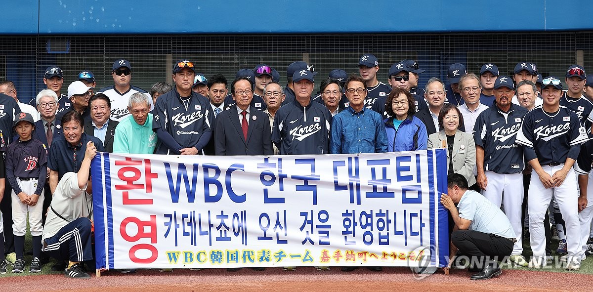 (가데나[일본 오키나와현]=연합뉴스) 이진욱 기자 = 23일 일본 오키나와현 가데나의 가데나 구장에서 2026 월드베이스볼클래식(WBC) 대한민국 야구대표팀과 한화의 연습경기에 앞서 류지현 감독과 대표팀 선수들이 지역 관계자들과 파이팅을 외치고 있다. 2026.2.23 cityboy@yna.co.kr