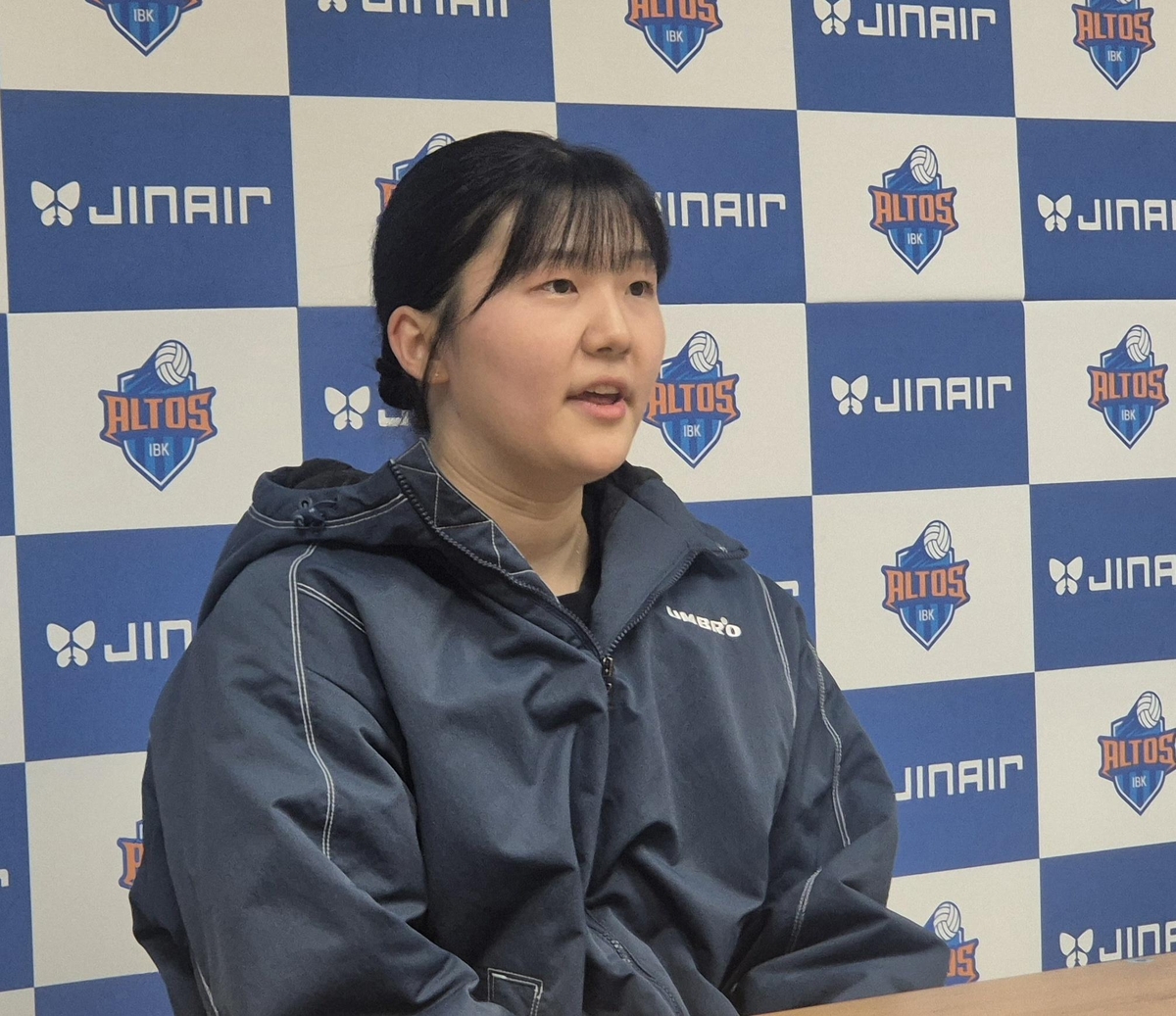 (화성=연합뉴스) 김경윤 기자 = IBK기업은행 공격수 전수민이 25일 화성종합체육관에서 열린 프로배구 여자부 페퍼저축은행과 홈 경기를 마친 뒤 인터뷰하고 있다. 2025.2.25. cycle@yna.co.kr