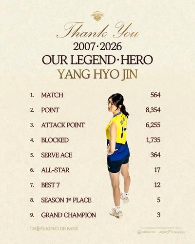 (서울=연합뉴스) 이동칠 기자 = 여자 프로배구의 '살아있는 전설'로 불렸던 베테랑 미들 블로커 양효진(37·현대건설)이 2025-2026시즌을 끝으로 20년 가까이 이어온 현역 프로 선수 생활을 끝내기로 하면서 그가 써온 V리그 역사가 새롭게 조명받고 있다.