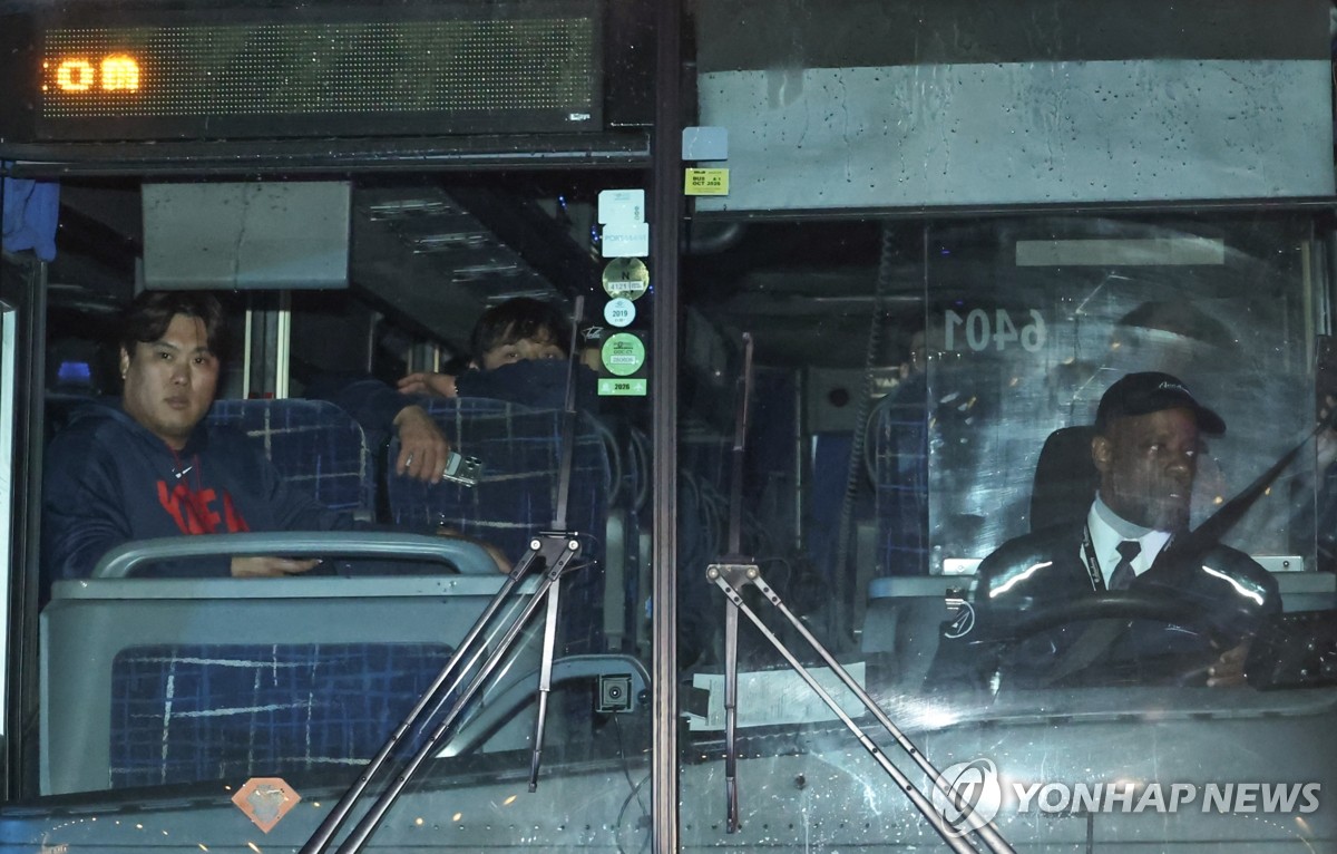 (마이애미=연합뉴스) 김인철 기자 = WBC 8강에 진출한 한국대표팀의 류현진과 박동원 등 선수단이 탑승한 버스가 11일(현지시간) 미국 플로리다주 마이애미의 한 호텔에 도착하고 있다. 2025.3.11 yatoya@yna.co.kr