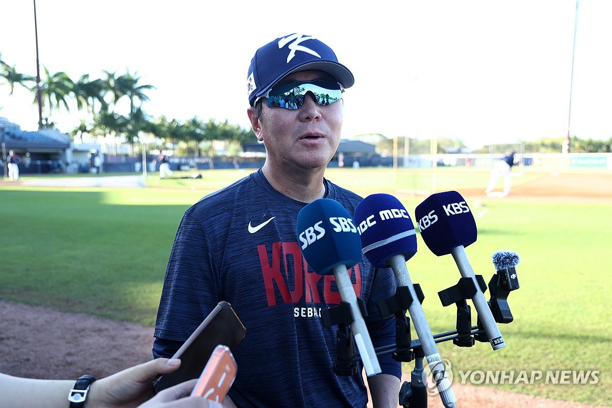 (마이애미=연합뉴스) 윤동진 기자 = 류지현 한국야구대표팀 감독이 11일(현지시간) 미국 플로리다주 마이애미 FIU 베이스볼 스타디움에서 열린 훈련에서 취재진과 인터뷰하고 있다. 2026.3.12 mon@yna.co.kr