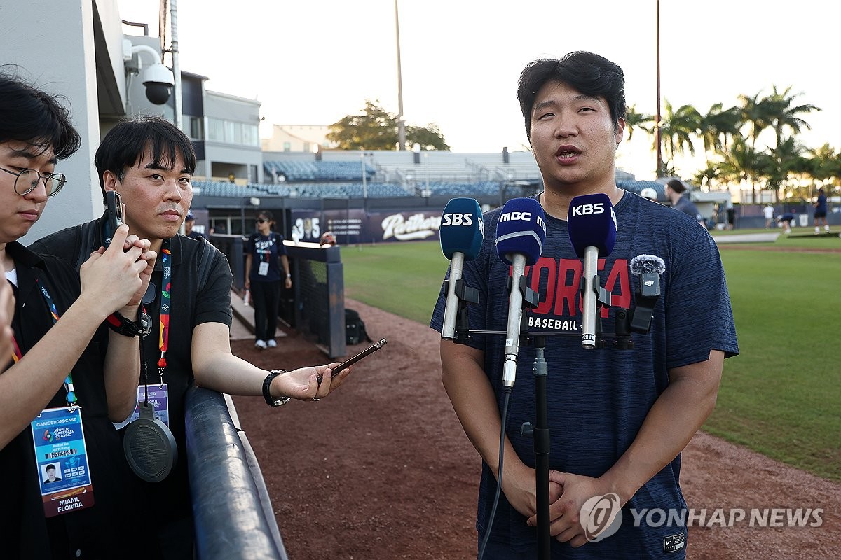 (마이애미=연합뉴스) 윤동진 기자 = 한국야구대표팀 문보경이 11일(현지시간) 미국 플로리다주 마이애미 FIU 베이스볼 스타디움에서 열린 훈련에서 취재진과 인터뷰하고 있다. 2026.3.12 mon@yna.co.kr