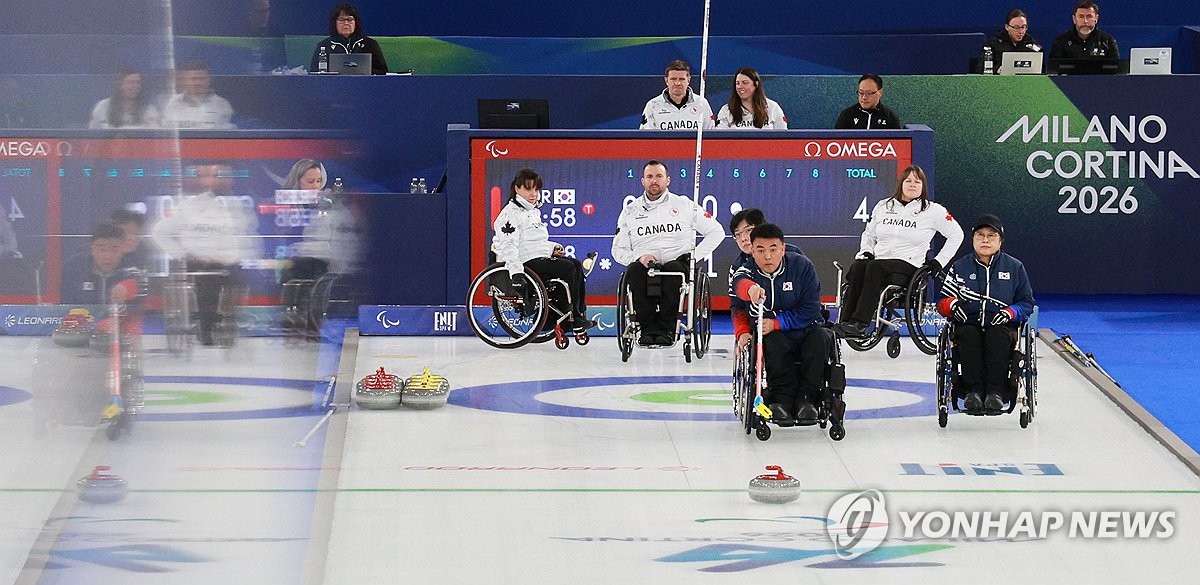 (코르티나담페초=연합뉴스) 한종찬 기자 = 13일(현지시간) 이탈리아 코르티나 컬링 올림픽 스타디움에서 열린 2026 밀라노·코르티나담페초 동계 패럴림픽 휠체어컬링 혼성 4인조 준결승 대한민국 대 캐나다의 경기. 대한민국 대표팀의 차진호가 스톤을 밀고 있다. 2026.3.13 saba@yna.co.kr