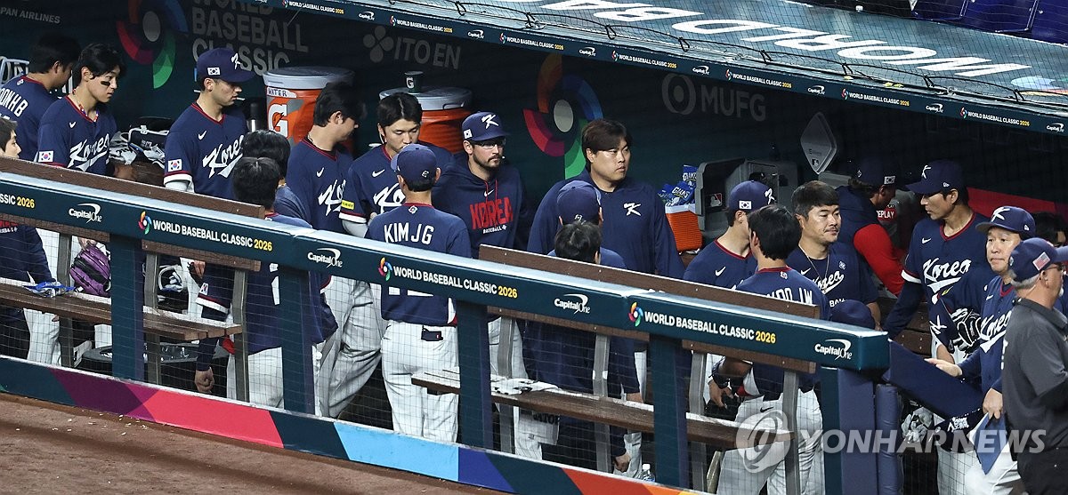 (마이애미=연합뉴스) 김인철 기자 = 13일(현지시간) 미국 플로리다주 마이애미 론디포파크에서 열린 월드베이스볼클래식(WBC) 대한민국과 도미니카공화국의 준준결승전 경기. 7회말 2사 1, 3루 도미니카 웰스에게 3점 홈런을 허용하며 콜드게임 패한 한국의 류현진과 선수들이 아쉬워하며 경기장을 나서고 있다. 2026.3.14 yatoya@yna.co.kr