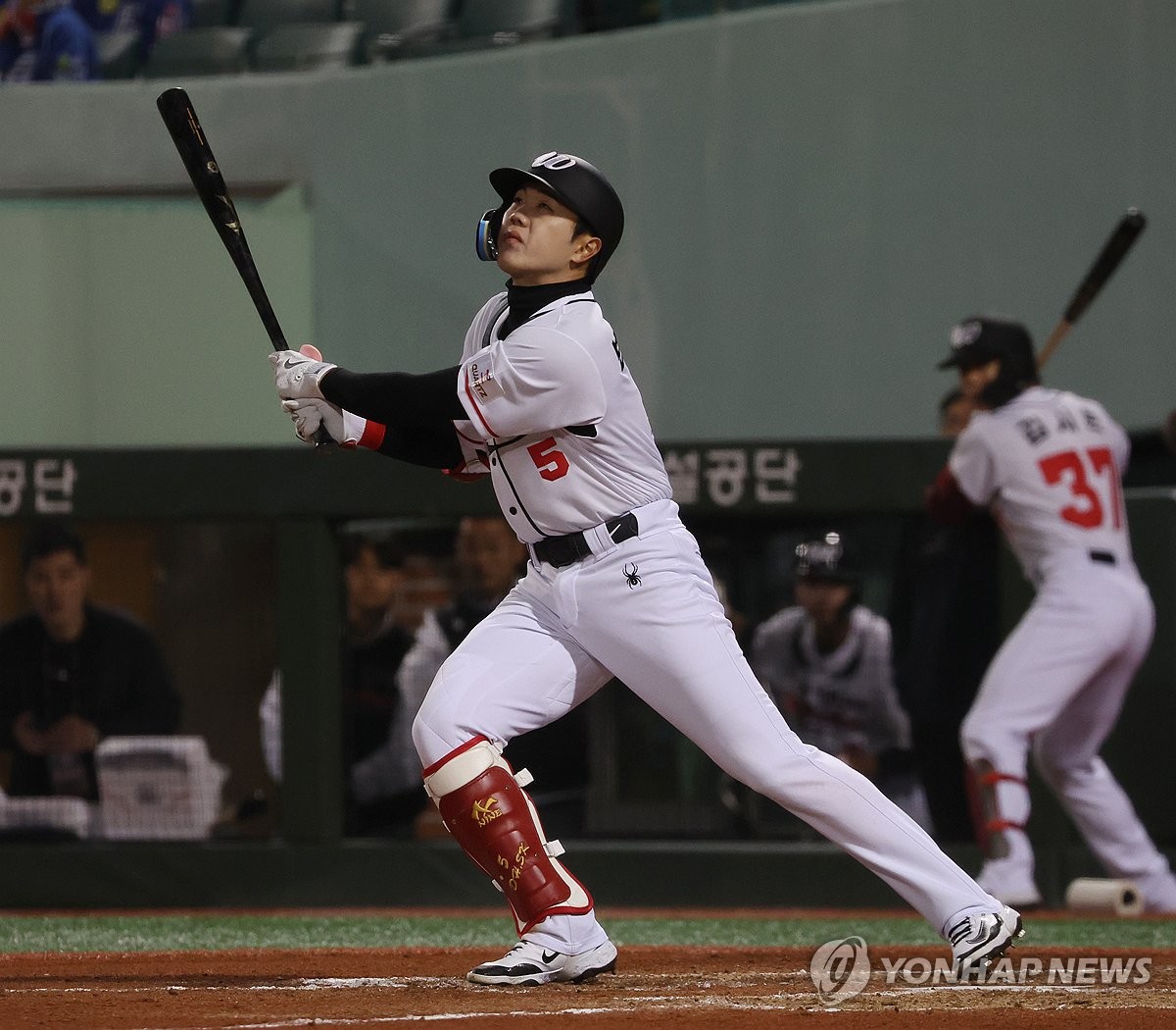 (울산=연합뉴스) 김용태 기자 = 20일 울산 문수야구장에서 열린 프로야구 KBO 퓨처스(2군)리그 울산 웨일즈와 롯데 자이언츠의 경기에서 울산 변상권이 타격 후 공을 바라보고 있다. 2026.3.20 yongtae@yna.co.kr