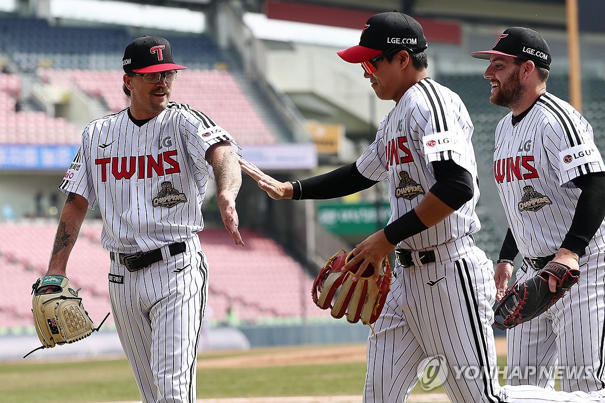 (서울=연합뉴스) 윤동진 기자 = 23일 잠실야구장에서 열린 2026 KBO리그 시범 경기 키움 히어로즈 대 LG트윈스 경기. LG 선발투수 웰스가 4회 초를 마친 후 동료들과 함께 더그아웃으로 향하고 있다. 2026.3.23 mon@yna.co.kr