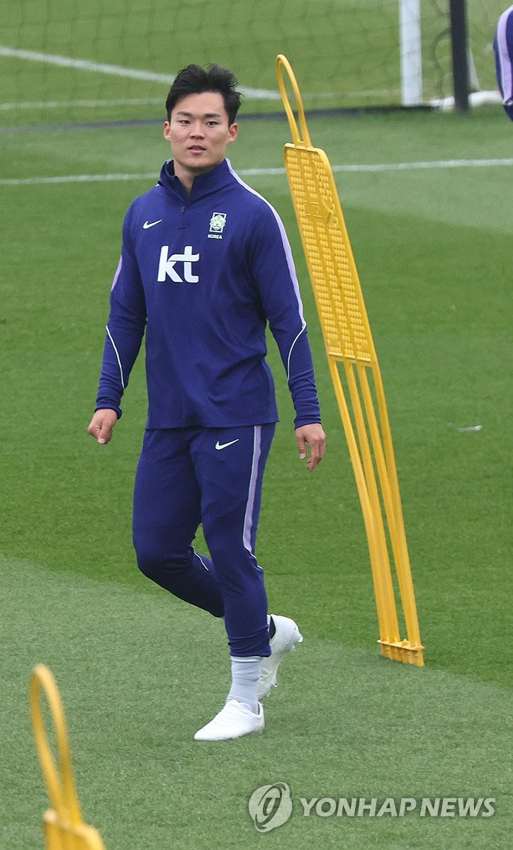 (밀턴킨스[영국]=연합뉴스) 최재구 기자 = 코트디부아르전을 앞둔 한국 축구 국가대표팀의 오현규가 24일(현지시간) 영국 런던 북서쪽 밀턴킨스에서 팀동료들과 훈련하고 있다. 2026.3.25 jjaeck9@yna.co.kr