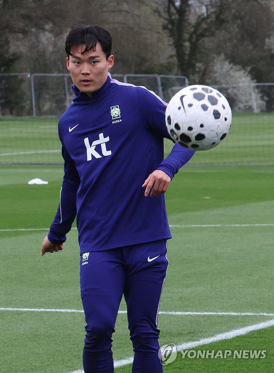 (밀턴킨스[영국]=연합뉴스) 최재구 기자 = 코트디부아르전을 앞둔 한국 축구 국가대표팀의 오현규가 24일(현지시간) 영국 런던 북서쪽 밀턴킨스에서 팀동료들과 훈련하고 있다. 2026.3.25 jjaeck9@yna.co.kr