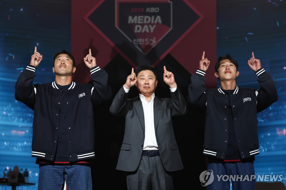 (서울=연합뉴스) 윤동진 기자 = 26일 서울 롯데호텔 월드에서 열린 2026 신한 SOL KBO 리그 미디어데이에서 롯데자이언츠 김태형 감독과 전준우, 전민재가 세리머니를 하고 있다. 2026.3.26 mon@yna.co.kr