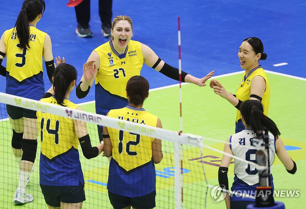 (수원=연합뉴스) 홍기원 기자 = 26일 경기도 수원체육관에서 열린 프로배구 V리그 여자부 플레이오프 1차전 현대건설과 GS칼텍스의 경기. 득점에 성공한 현대건설 선수들이 기뻐하고 있다. 2026.3.26 xanadu@yna.co.kr