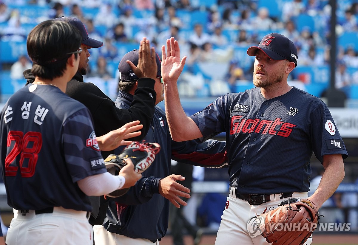 (대구=연합뉴스) 김현태 기자 = 29일 대구 삼성라이온즈파크에서 열린 2026 신한 SOL뱅크 KBO리그 롯데 자이언츠와 삼성 라이온즈 경기. 5회까지 1실점 한 롯데 선발투수 비슬리가 마운드를 내려오며 동료들의 축하를 받고 있다. 2026.3.29 mtkht@yna.co.kr