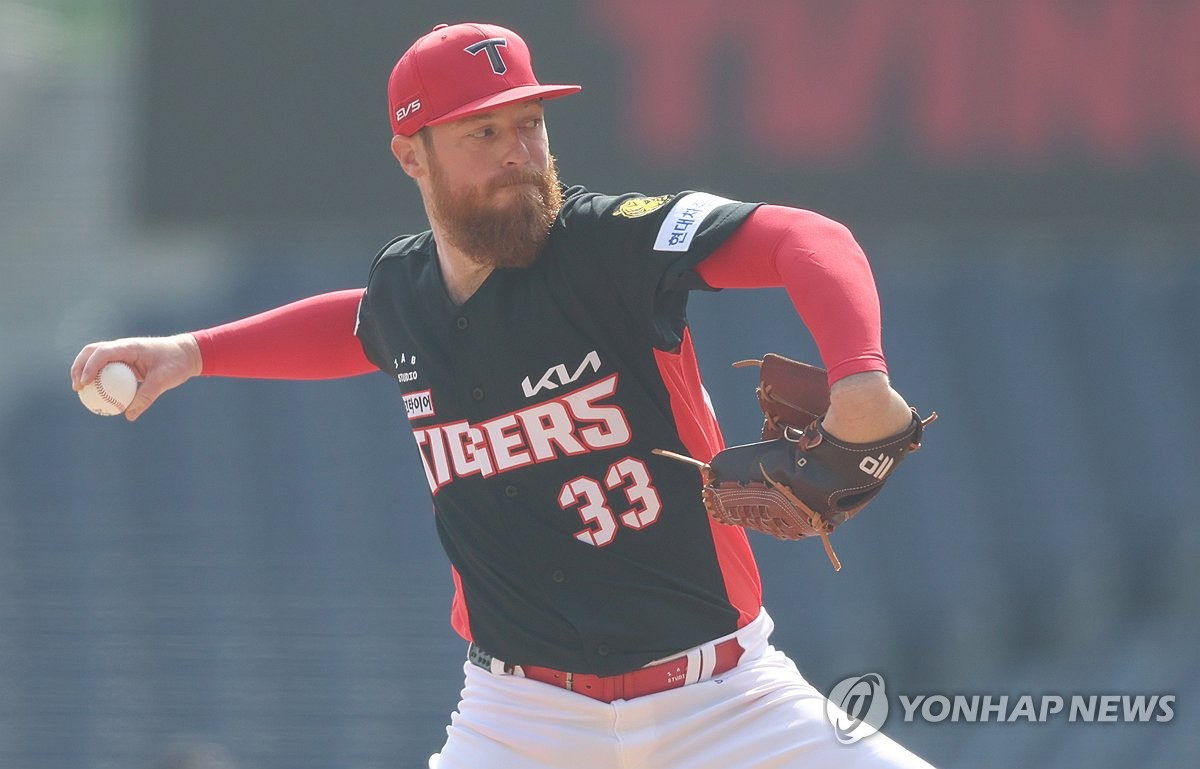 (창원=연합뉴스) 김동민 기자 = 17일 경남 창원NC파크에서 열린 KIA 타이거즈와 NC 다이노스의 시범경기. 5회 말 KIA 애덤 올러가 역투하고 있다. 2026.3.17 image@yna.co.kr