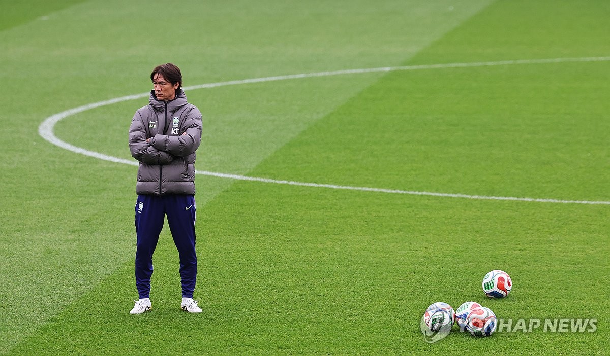 (밀턴킨스[영국]=연합뉴스) 최재구 기자 = 코트디부아르전을 하루 앞둔 한국 축구 국가대표팀의 홍명보 감독이 27일(현지시간) 영국 밀턴킨스 스타디움 MK에서 선수들의 훈련을 지켜보고 있다. 2026.3.28 jjaeck9@yna.co.kr