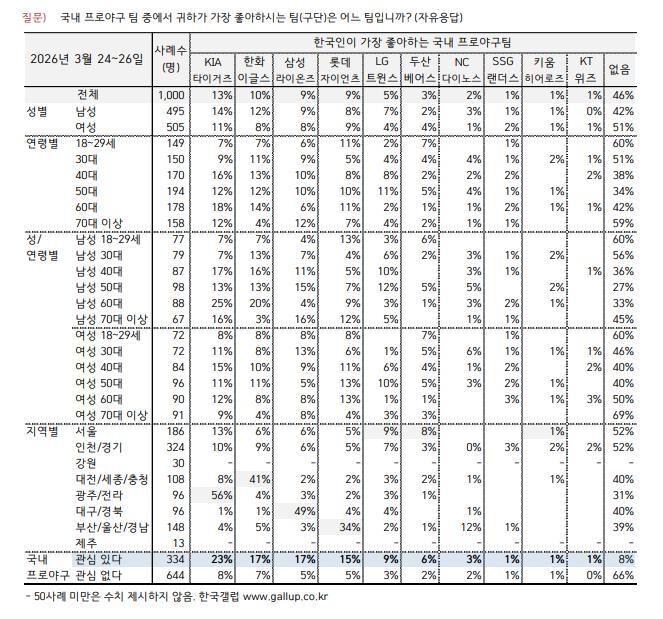 남성 응답자는 KIA(14%), 한화(12%), 삼성(9%), 롯데(8%), LG(7%), NC(3%), 두산(2%), SSG, 키움(이상 1%), kt(0%) 순으로, 여성은 KIA(11%), 롯데(9%), 한화와 삼성(이상 8%), LG, 두산(이상 4%), SSG(2%), NC, 키움, kt(이상 1%) 순으로 선호했다.