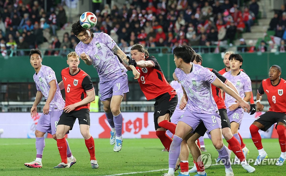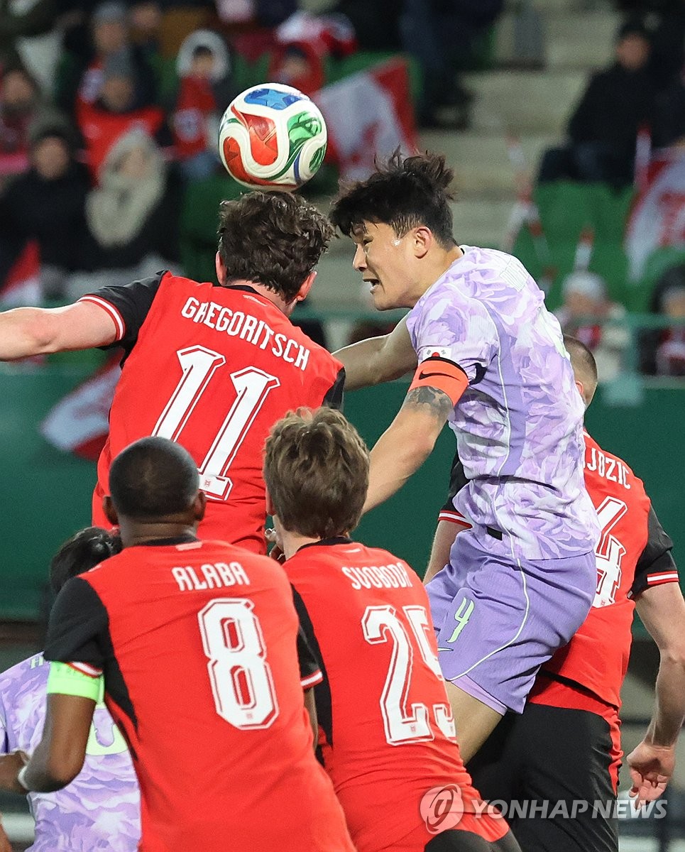 (빈[오스트리아]=연합뉴스) 최재구 기자 = 31일(현지시간) 오스트리아 빈 에른스트 하펠 스타디움에서 열린 한국 축구 국가대표팀과 오스트리아의 평가전에서 김민재가 오스트리아 문전에서 헤딩슛을 시도하고 있다. 2026.4.1 jjaeck9@yna.co.kr