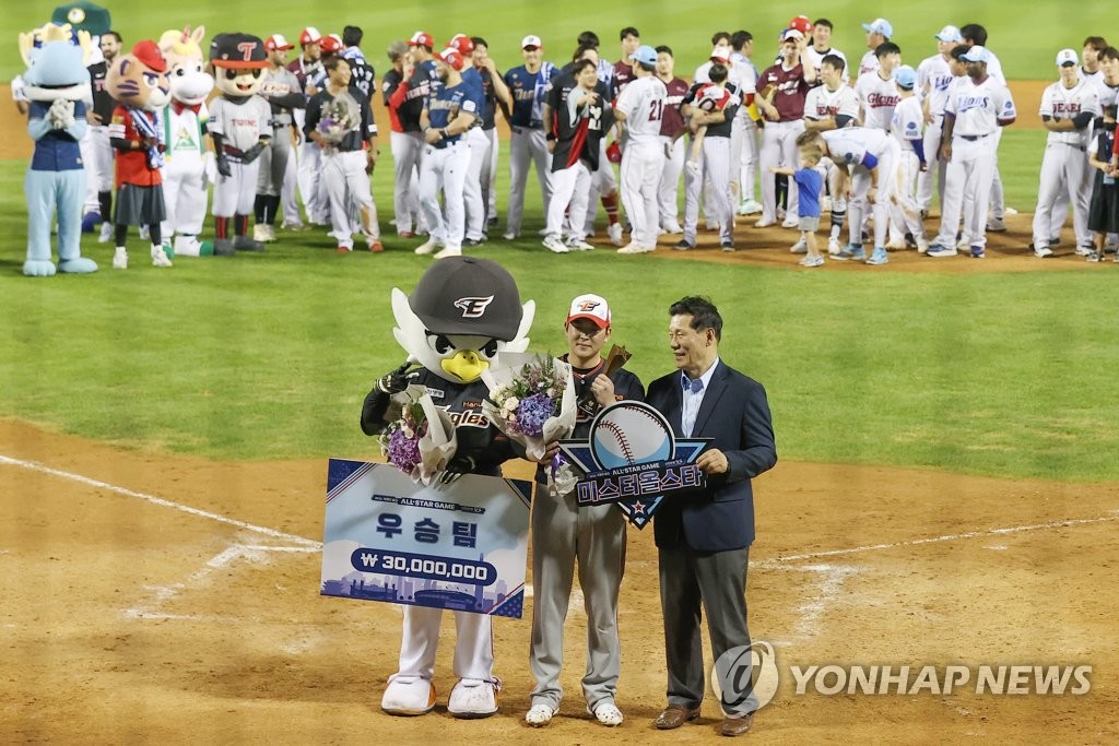 (서울=연합뉴스) 신현우 기자 = 16일 서울 잠실야구장에서 열린 '2022 신한은행 SOL KBO 올스타전' 드림올스타 대 나눔올스타의 경기를 마친 뒤 미스터 올스타로 선정된 나눔올스타 한화 정은원이 기념촬영을 하고 있다. 2022.7.16 nowwego@yna.co.kr