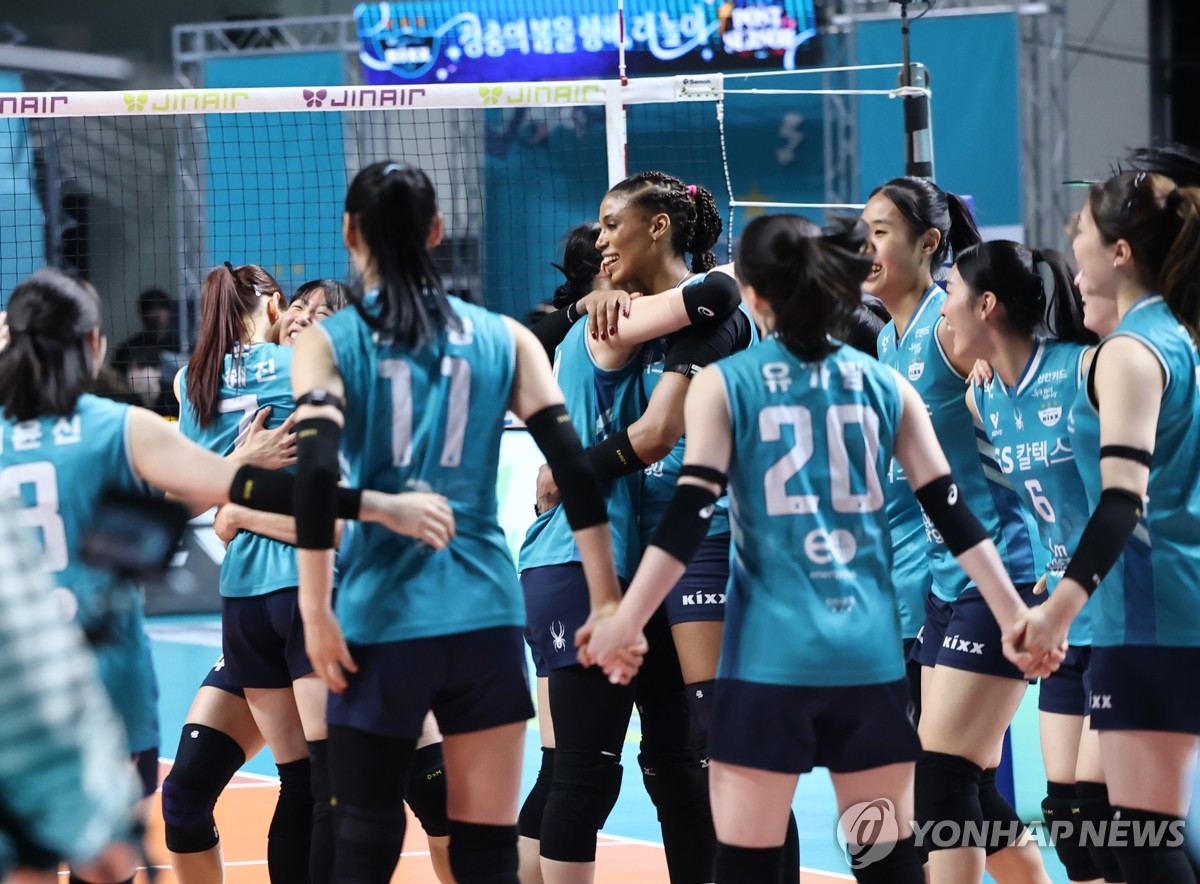(서울=연합뉴스) 윤동진 기자 = 5일 서울 장충체육관에서 열린 챔피언결정전 한국도로공사 대 GS칼텍스 3차전 경기에서 우승을 차지한 GS칼텍스 선수들이 기뻐하고 있다. 2026.4.5 mon@yna.co.kr