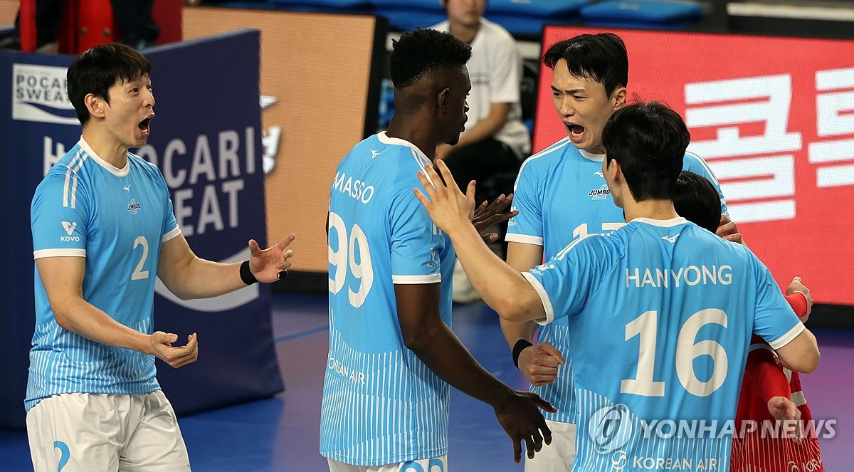 (천안=연합뉴스) 양영석 기자 = 6일 천안 유관순체육관에서 열린 프로배구 챔피언결정전 3차전 현대캐피탈과 대한항공 경기. 득점에 성공한 대한항공 선수들이 환호하고 있다.2026.4.6 youngs@yna.co.kr