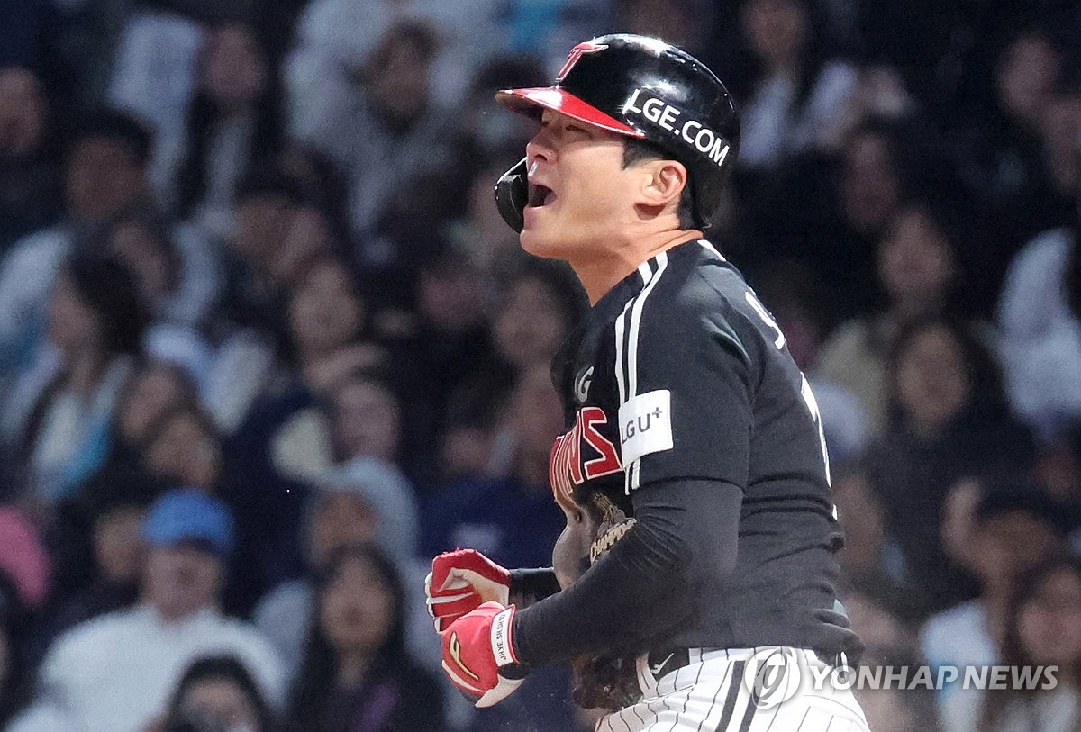(창원=연합뉴스) 박영민 기자 = 8일 경남 창원NC파크에서 열린 프로야구 2026 KBO리그 LG 트윈스와 NC 다이노스의 경기. 8회 초 2사 2루 상황 LG 6번 오지환이 2타점 그라운드 홈런을 치고 포효하고 있다. 2026.4.8 ymp@yna.co.kr