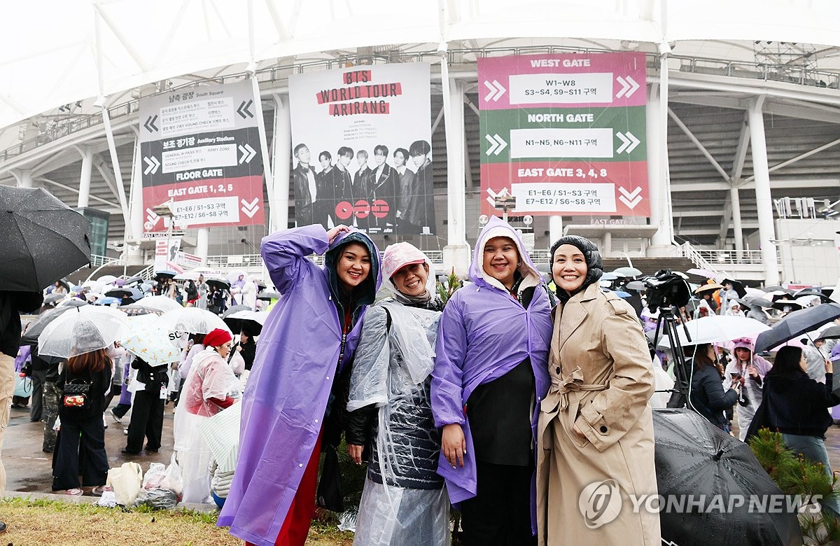 (고양=연합뉴스) 김병만 기자 = 9일 오후 경기도 일산 고양종합운동장 주경기장에서 BTS 월드투어 '아리랑' 첫 공연을 보러 인도네시아에서 온 팬들이 기념촬영하고 있다. 2026.4.9 kimb01@yna.co.kr