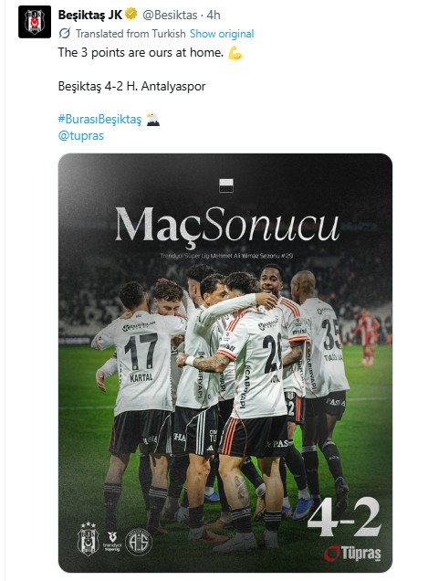 베식타시는 11일 오전(한국시간) 튀르키예 이스탄불의 튀프라쉬 스타디움에서 열린 안탈리아스포르와의 2025-2026 튀르키예 쉬페르리그 29라운드 홈 경기에서 4-2로 이겼다.