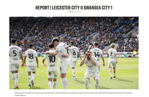 스완지 시티는 12일(한국시간) 영국 레스터의 킹 파워 스타디움에서 끝난 2025-2026 챔피언십 42라운드 원정 경기에서 엄지성의 도움에 이은 잔 비포트니크의 골로 레스터 시티에 1-0 승리를 거뒀다.